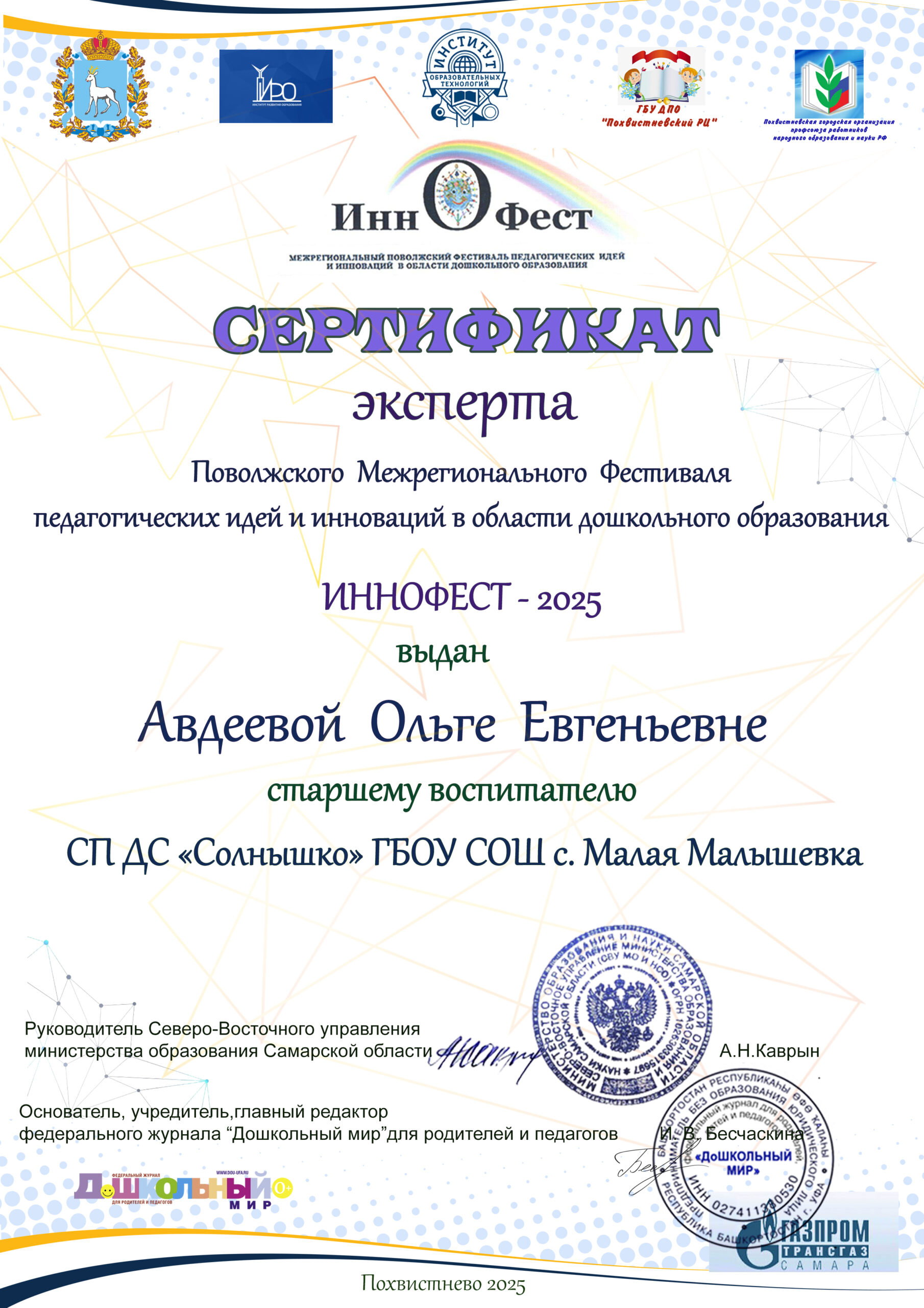 Участие в работе жюри, экспертных групп 11.11.2025г В составе жюри окружного этапа конкурса образовательных организаций, внедряющих инновационные образовательные программы дошкольного образования «Детский сад года — 2025» (распоряжение) Октябрь 2025г Эксперт Поволжского межрегионального Фестиваля педагогических идей и инноваций в области дошкольного образования «ИннОФест-2025» (сертификат) Октябрь 2025 г В составе жюри окружного конкурса «Будущие профессионалы 5+» ( Распоряжение, приложение к распоряжению) октябрь 2025. Являлась членом экспертной комиссии по проведению отбора на присвоение статуса «Окружная пилотная площадка КУМО СО по реализации ФГОС ДО в соответствии с ФОП ДО в 2025-2026 учебном году (подробнее: распоряжение ) в июне 2025. В составе экспертной группы по проведению экспертизы образовательной программы дошкольного образования образовательных учреждений, реализующих основные общеобразовательные программы дошкольного образования, Кинельского образовательного округа (распоряжение, справка) март 2025. В составе жюри всероссийского фестиваля детского и молодежного научно-технического творчества «Космофест» 2025г. (благодарность) 03 февраля 2025 Входила в состав жюри окружного этапа технологического конкурса «ИКАРёнок» (подробнее: выписка из распоряжения, справка) 18 ноября 2024. Являлась членом экспертной комиссии по проведению отбора на присвоение статуса «Окружная пилотная площадка КУМО СО по реализации ФГОС ДО в соответствии с ФОП ДО в 2024-2025 учебном году (подробнее: распоряжение №131-р от 08.11.2024г, справка) 15 ноября 2024. В составе жюри окружного этапа конкурса образовательных организаций, внедряющих инновационные образовательные программы дошкольного образования «Детский сад года — 2024» (подробнее: распоряжение, справка) 28 октября 2024. В составе конкурсной комиссии регионального конкурса «Призвание – учить!» в 2024 году по номинации «Воспитатель в дошкольном образовании» в 2024 году по номинации «Воспитатель в дошкольном образовании»(подробнее: распоряжение, приложение 9) 07 июня 2024. В составе экспертной группы по проведению экспертизы ООП ДОО в соответствии с ФГОС ДО и учетом ФОП ДО (распоряжение) март 2024. В составе экспертной группы всероссийского фестиваля детского и молодежного научно-технического творчества «Космофест» 2024г. (благодарность) 29 февраля 2024. В составе жюри окружного этапа профессионального конкурса Воспитатель года 2023 (подробнее: распоряжение, справка) Декабрь 2023г. Начинающий эксперт МКДО (приглашение, сертификат) Декабрь 2023г. Региональный методист Самарской области (Распоряжение МОиН СО №291-р, Распоряжение МОиН СО №1427-р) 15 ноября 2023. В составе жюри окружного этапа конкурса образовательных организаций, внедряющих инновационные образовательные программы дошкольного образования «Детский сад года — 2024» (подробнее: распоряжение, справка) Октябрь 2023 г В составе жюри окружного конкурса «Будущие профессионалы 5+» (приказ, справка ) Апрель 2023 г В составе Экспертной группы по оценке системы качества дошкольного образования в Кинельском округе (Распоряжение) Март -апрель 2023 В составе жюри дистанционного (март) и очного (апрель) (г.Тольятти) этапа и полуфинала открытого регионального конкурса профессионального мастерства молодых педагогов дошкольного образования «Большой педагогический турнир» в 2023г. ( Приглашен